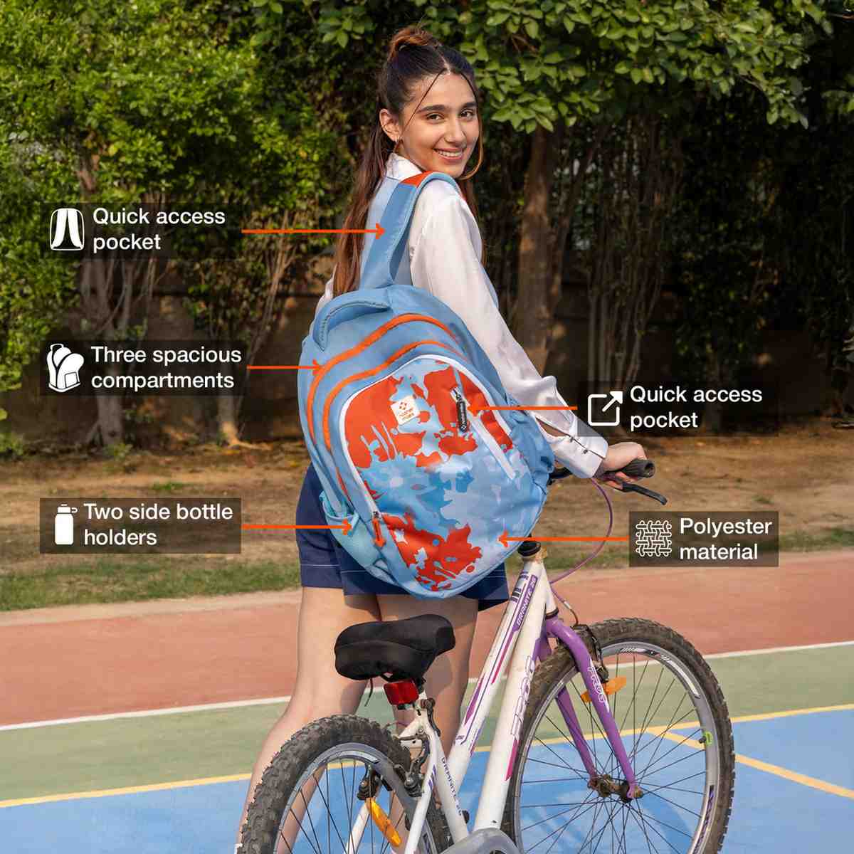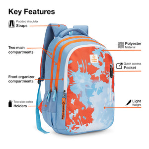 Durable Material: Crafted from sturdy polyester fabric, this backpack is built to safeguard your school or college essentials with durability and longevity. With a spacious of 45-liter capacity. The trendy printed design adds a stylish flair, making it a perfect match for casual outfits and uniforms.